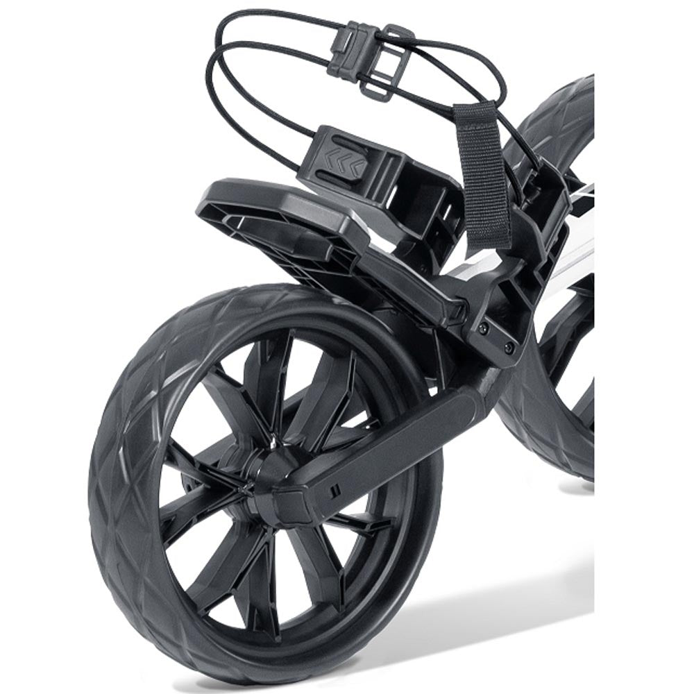 Das selbstöffnende Sprung-Feder-System ermöglicht das mühelose Auf- und Zusammenklappen des Trolleys – ein innovatives Highlight auf dem Markt. Der Trolley vereint Leichtigkeit, Stabilität und ultimativen Fahrkomfort. Die voll ausgestattete Scorekarten-Konsole beinhaltet einen integrierten Getränkehalter, Mobilgerätehalter und Golfballaufbewahrung. Zusätzlich verfügt der Trolley über eine extragroße Zubehörtasche unter der Scorekarten-Konsole sowie praktische elastische Bungee-Kabel zur sicheren Fixierung der Golftasche. Die komfortable Feststellbremse am Griff rundet die Ausstattung ab.