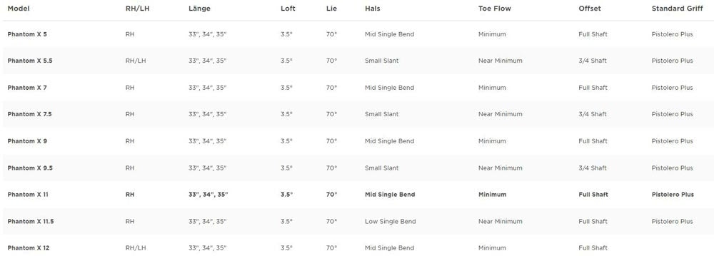 Jeder der aktuellen Phantom X Putter kombiniert Stahl und Aluminium, wobei neun der 10 Modelle speziell mit einer massiven, präzisionsgefrästen Schlagfläche und einem Körper aus 303 Edelstahl entwickelt wurden, die fachmännisch mit einer Sohle und Flanschkomponente aus 6061 Flugzeugaluminium verschmolzen sind. Alle Modelle der Phantom X-Linie bieten Golfern mehrere Schlägeroptionen in 33", 34" und 35" Länge, jeweils mit einer von vier spezifischen Schlägerhals/Schaft-Konfigurationen.